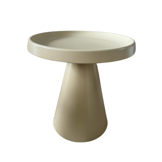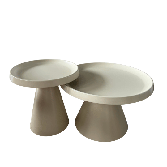 Rounded pedestal coffee table with a smooth stone look in light grey.