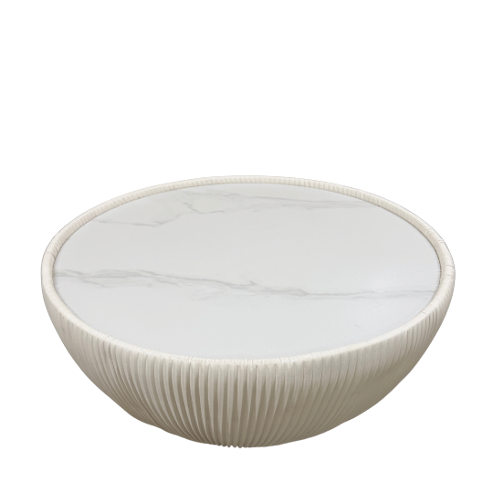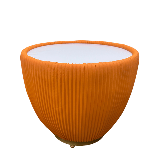 Two-tone coffee table featuring white and orange finishes with a sculptural base.